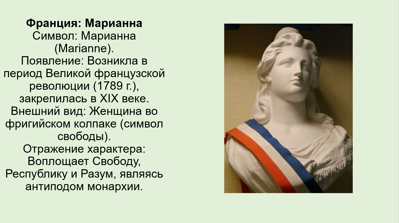 Добавить текст Озвучить Вернуть оригиналНациональный характер: Воплощает Республику, Свободу, Разум и национальный дух (в противовес монархии).
