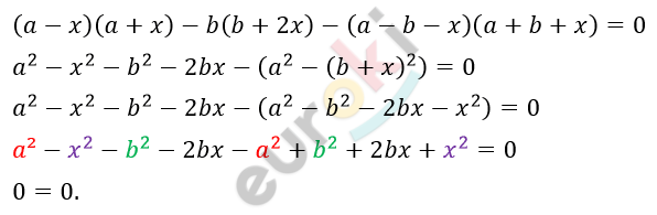 Докажите, что верно равенство (a-x)(a+x)-b(b+2x)-(a-b-x)(a+b+x)=0.