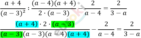 \[\frac{a + 4}{a^{2} - 6a + 9}\ :\frac{a^{2} - 16}{2a - 6} - \frac{2}{a - 4} =\]
