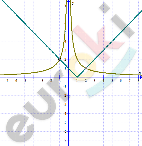 \[\left\{ \begin{matrix} y = \frac{2}{|x|}\text{\ \ \ \ \ \ \ \ } \\ y = |x - 1| \\ \end{matrix} \right.\ \]