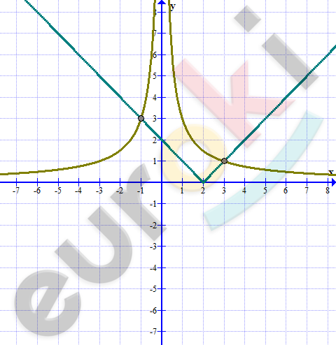 \[\left\{ \begin{matrix} y = \frac{3}{|x|}\text{\ \ \ \ \ \ \ \ } \\ y = |x - 2| \\ \end{matrix} \right.\ \]