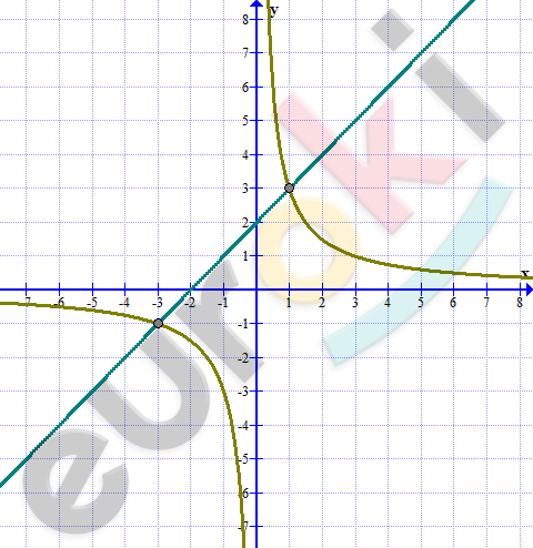 \[\left\{ \begin{matrix} y = \frac{3}{x}\text{\ \ \ \ \ \ } \\ y = x + 2 \\ \end{matrix} \right.\ \]