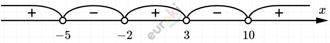 \[- 5 < x < - 2;\ \ 3 < x < 10.\]