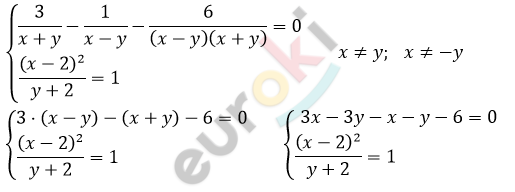 \[\left\{ \begin{matrix} \frac{3}{x + y} + \frac{1}{y - x} = \frac{6}{x^{2} - y^{2}} \\ \frac{(x - 2)^{2}}{y + 2} = 1\ \ \ \ \ \ \ \ \ \ \ \ \ \ \ \ \ \ \ \ \ \ \ \\ \end{matrix}\text{\ \ \ \ \ } \right.\ \]