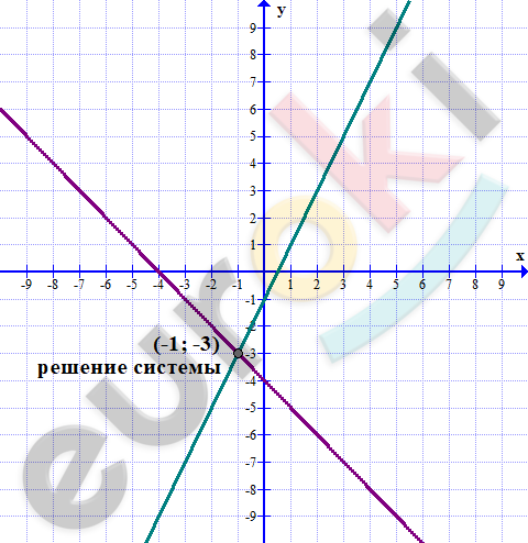 \[\left\{ \begin{matrix} y = 2x - 1 \\ x + y = - 4 \\ \end{matrix} \right.\ \text{\ \ \ \ \ \ \ \ }\left\{ \begin{matrix} y = 2x - 1 \\ y = - 4 - x \\ \end{matrix} \right.\ \]