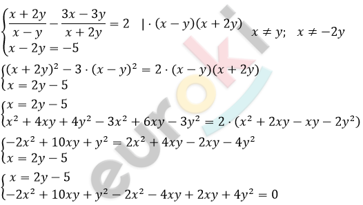 \[\left\{ \begin{matrix} x = 2y - 5\ \ \ \ \ \ \ \ \ \ \ \ \ \ \ \ \ \ \ \ \ \ \\ - 4x^{2} + 8xy + 5y^{2} = 0 \\ \end{matrix} \right.\ \]