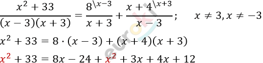 \[\frac{x^{2} + 33}{x² - 9} = \frac{8}{x + 3} - \frac{x + 4}{3 - x}\]