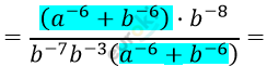 \[\frac{a^{- 6} + b^{- 6}}{b^{- 7}}\ :\frac{a^{- 6}b^{- 3} + b^{- 9}}{b^{- 8}} =\]