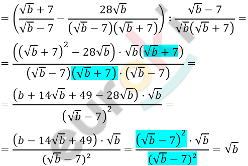 \[\left( \frac{\sqrt{b} + 7}{\sqrt{b} - 7} - \frac{28\sqrt{b}}{b - 49} \right)\ :\frac{\sqrt{b} - 7}{b + 7\sqrt{b}} =\]